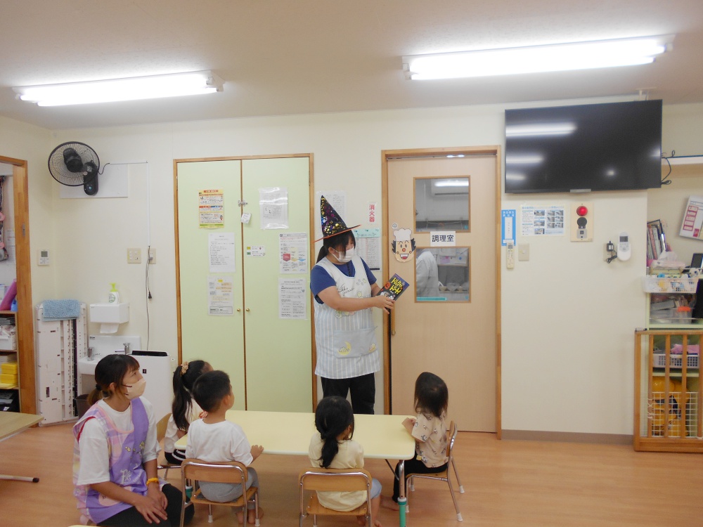 ハロウインの行事を行いました🎃 2歳児クラスうさぎ組が集中してお話を聞いている様子です。 このあと、折り紙で作ったキャンディー探しごっこをしたり、 ハロウイン衣装を着て写真を撮ったりして遊びました(^^♪