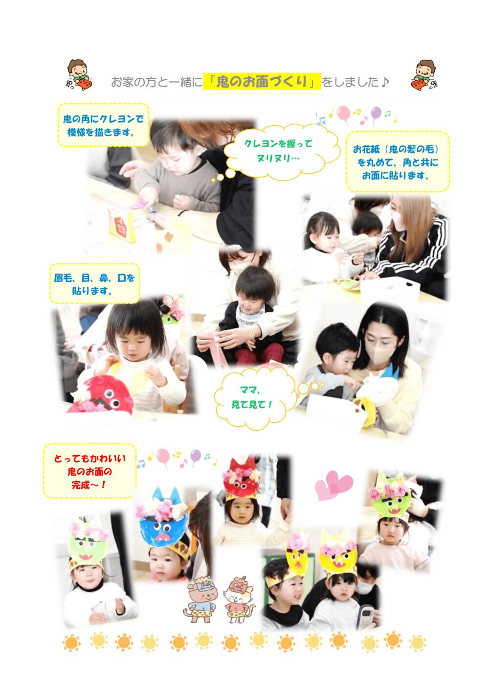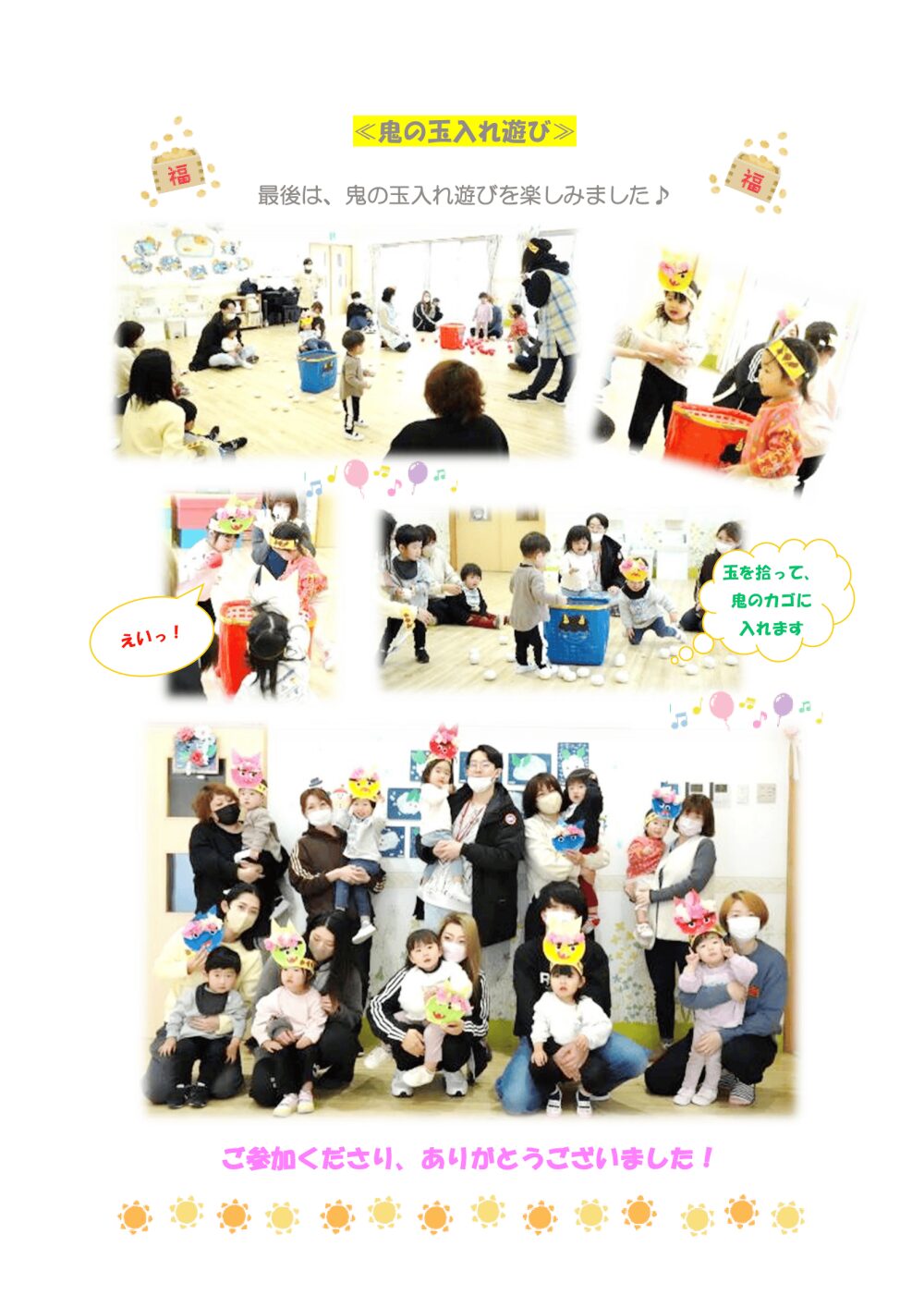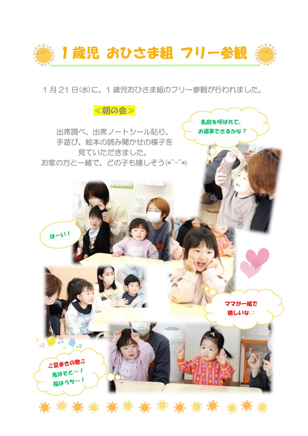 各保育園からのお知らせや、通園中のお子さまが行事で楽しく過ごす様子を、日々お伝えしていきます。 子どもたちの成長している様子や各園からの大切なお知らせをご確認ください。